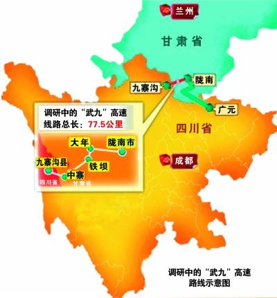 武九高速公路起點位于武都區桔柑鄉賈家坪村,與武罐高速公路以樞紐立交相接,終點位于文縣青龍橋(甘川界),順接綿陽至九寨溝高速公路,路線全長100.6公里,估算投資179.61億元。