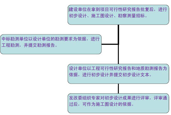 工程設(shè)計(jì)主要包括初步設(shè)計(jì)和施工圖設(shè)計(jì)。對(duì)于技術(shù)上復(fù)雜,又缺乏經(jīng)驗(yàn)的項(xiàng)目,可以在初步設(shè)計(jì)和施工圖設(shè)計(jì)兩個(gè)階段間增加技術(shù)設(shè)計(jì)。對(duì)于小型并技術(shù)簡(jiǎn)單的道路工程,經(jīng)有關(guān)部門同意后,可以利用方案設(shè)計(jì)代替初步設(shè)計(jì),按方案設(shè)計(jì)審批后直接轉(zhuǎn)入施工圖設(shè)計(jì)。典型的流程圖如下: