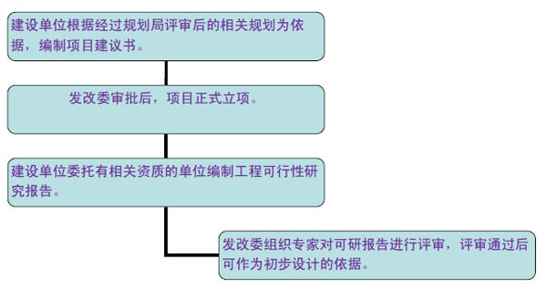 市政工程設(shè)計(jì)的前期工作主要包括項(xiàng)目立項(xiàng)、預(yù)可行性研究和工程可行性研究。對(duì)已明確建設(shè)必要性的工程項(xiàng)目,前期工作可以直接進(jìn)入工程可行性研究。典型的流程圖如下: