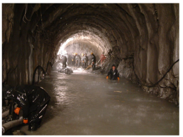 有時遇到填滿飽含水分的充填物溶槽,坑道掘進至邊緣時,充填物不斷涌入坑道,難以遏止,甚至地表開裂下沉,山體壓力劇增;有的溶洞、暗河迂回交錯、分支錯綜復雜、范圍寬廣,處理十分困難。