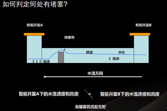 美國某城市采用了智能井蓋結(jié)合 IBM 的智慧城市平臺,提前應(yīng)對強(qiáng)降雨天氣對市民的影響。該城市部署了 44 個(gè)智能井蓋,每 5 分鐘這些井蓋就往運(yùn)營平臺發(fā)送一次數(shù)據(jù),其中包括水位、水流速和水溫。同時(shí),該系統(tǒng)還整合了氣象信息,城市管網(wǎng)拓?fù)湫畔ⅲ煌ㄐ畔⒌取O聢D說明了分析技術(shù)如何通過智能井蓋的信息分析管道的擁堵。