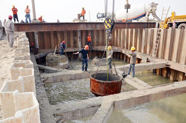 用袋砌法澆筑水下混凝土,系把混凝土半滿地裝入牢固的麻袋或布袋中,由潛水員在水下進行砌澆。袋的孔隙應能使砂漿滲出但不宜過大。采取這種澆筑方法,袋與袋之間的層面,雖然可以從袋孔中擠出的水泥漿互相膠結,但其整體性終究是很差的。此種混凝土的坍落度以5~7cm為宜,不得采用干拌混凝土。混凝土袋應交錯放置,相互靠緊。