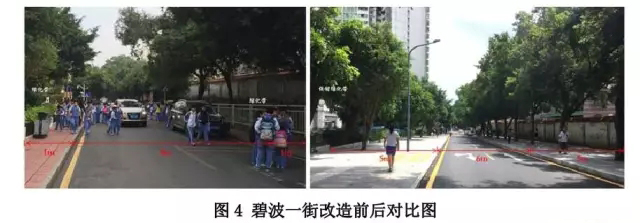● 碧波一街:原雙向2 車(chē)道機(jī)動(dòng)車(chē)道寬度從8 米壓縮為6 米,利用兩側(cè)消極的綠化帶,將兩側(cè)人行道寬度從1 米加寬到5 米。