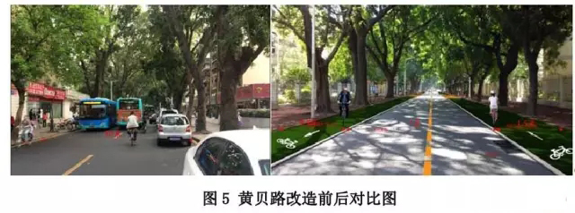 ● 黃貝路:原10 米機(jī)動(dòng)車(chē)道壓縮為7 米,在兩側(cè)各設(shè)置1.5 米寬自行車(chē)道,解決自行車(chē)出行和地鐵接駁需要。