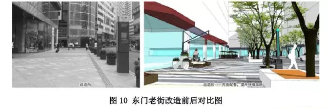 ● 東門(mén)老街:機(jī)動(dòng)車(chē)道由10 米壓縮至6 米,兩側(cè)人行道分別從5 米加寬至7 米,從8米加寬至10米。