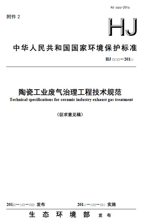 為貫徹《中華人民共和國環(huán)境保護法》和《中華人民共和國大氣污染防治法》等法律法規(guī),防治環(huán)境污染,改善大氣環(huán)境質(zhì)量,規(guī)范陶瓷工業(yè)廢氣治理工程的建設(shè)與運行管理,我部決定制定《陶瓷工業(yè)廢氣治理工程技術(shù)規(guī)范》。