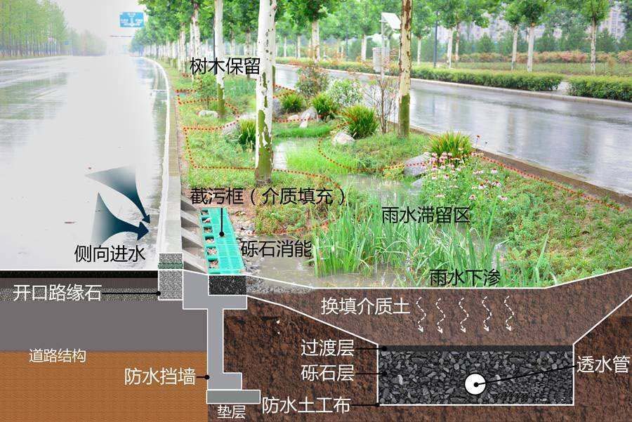 市政道路在城市各類基礎設施中所占的比例是很大的,但受到市政道路自身平面性和帶狀性的限制,“海綿城市”理念的運用主要體現在“滲、滯、凈、排”4個方面。例如,透水路面可以使雨水下滲,并通過結構層和基層的過濾實現水體凈化,從而完成對地下水的補充;下凹式綠地可以減慢徑流的流速,并通過雨水管網實現排放,降低市政雨水管網系統的壓力。