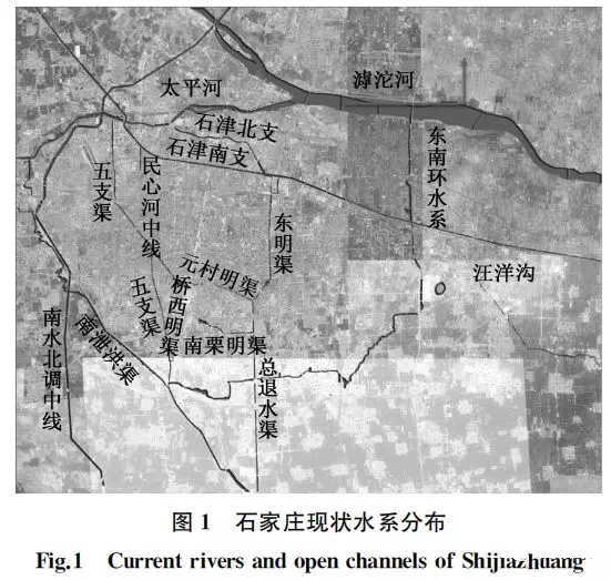 石家莊市區(qū)內(nèi)河以民心河與東南環(huán)水系為主。民心河是基于1954~1982年建設(shè)的農(nóng)灌與排澇渠道修繕聯(lián)通形成的明渠水系,主要包括總退水渠、元村明渠、南栗明渠、橋西明渠、東明渠、五支渠等;東南環(huán)水系則為2010年石家莊開始建設(shè)的集防洪排澇、生態(tài)景觀等功能為一體的環(huán)城水系長廊。石家莊現(xiàn)狀水系分布見圖1。