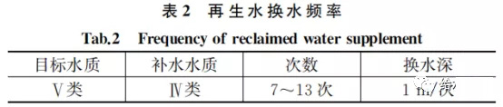 (1)換水法。通過周期換水是確保河道納污能力,水質(zhì)穩(wěn)定主要措施。根據(jù)納污能力(自凈能力)確定換水量是較為合理的水體補(bǔ)水量計算方法。實(shí)際工程中,多利用已有研究簡化計算步驟,直接確定換水頻次。如根據(jù)《城市污水再生利用景觀用水水質(zhì)》(GB/T 18921-2002),完全使用再生水的河道水力停留時間宜在5 d之內(nèi),根據(jù)與石家莊狀況類似的《北京市水資源綜合規(guī)劃》的研究成果,利用再生水維持目標(biāo)水質(zhì)的換水頻率如表2所示。