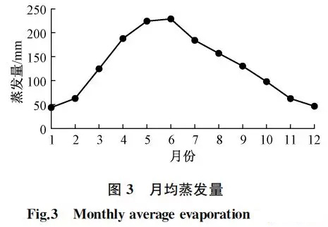 根據(jù)石家莊市氣象統(tǒng)計數(shù)據(jù),以6月蒸發(fā)量為河道蒸發(fā)計算的最大口徑,確定蒸發(fā)系數(shù)為7.38 mm/d。由于石家莊多為硬質(zhì)渠底,下滲速率忽略不計,月均蒸發(fā)量見圖3。