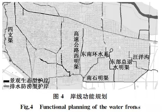 石家莊市明渠以排澇功能為主,兼顧景觀休閑功能,參照《地表水環(huán)境質(zhì)量標(biāo)準(zhǔn)》,主要以人體非直接接觸的娛樂用水區(qū)和一般景觀要求水域為主。結(jié)合河道功能布局,確定不同斷面水質(zhì)標(biāo)準(zhǔn)在Ⅳ類或Ⅴ類。其中景觀生態(tài)型岸線是重要的親水活動空間,需確保Ⅳ類水質(zhì)要求,岸線功能規(guī)劃見圖4。