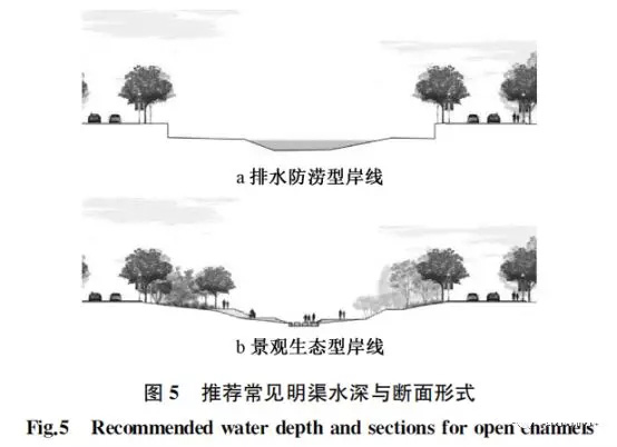 綜合考慮以上因素,結(jié)合不同區(qū)域渠道斷面以及功能定位,除東南環(huán)水系外,確定渠道水深控制在0.5 m以內(nèi)。同時根據(jù)現(xiàn)有梯形斷面的深度情況,控制水深基本維持在0.3 m左右。推薦常見明渠水深與斷面形式見圖5。