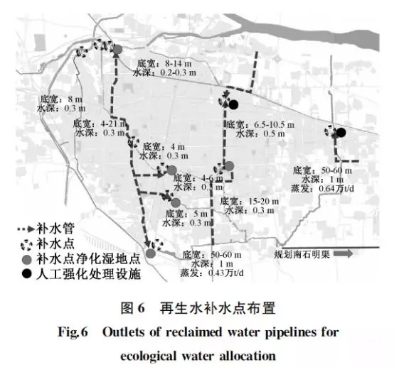 補(bǔ)水點(diǎn)位置的選擇主要考慮4方面因素:①補(bǔ)水點(diǎn)是渠道水力條件的重要影響因素,從而影響水體自凈能力,考慮到渠道補(bǔ)水的連貫性,補(bǔ)水點(diǎn)優(yōu)先選擇在各渠道的起端;②考慮控制渠道水深相對一致,在斷面變化較大,或者周邊存在較大河道取水需求的上游增加補(bǔ)水點(diǎn);③為減少再生水管網(wǎng)運(yùn)行水頭,在補(bǔ)水量大,距離長的河道進(jìn)行分段補(bǔ)水;④考慮到近期再生水水質(zhì)標(biāo)準(zhǔn)低于地表水環(huán)境質(zhì)量標(biāo)準(zhǔn)確定的V類水體,補(bǔ)水點(diǎn)處應(yīng)有空間建設(shè)再生水凈化濕地等設(shè)施,進(jìn)一步提高補(bǔ)水水質(zhì)。