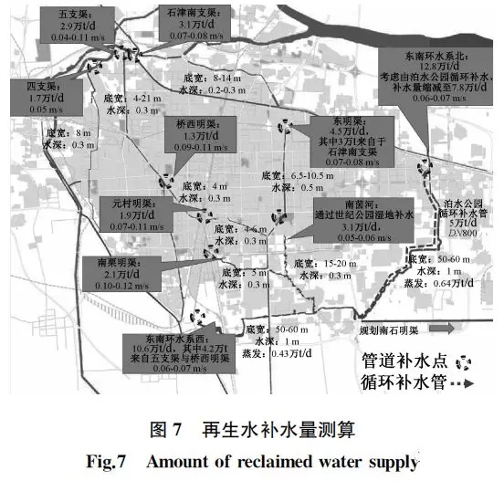 根據(jù)確定的邊界條件,以及補(bǔ)水點(diǎn)的布置,最終確定各渠道補(bǔ)水量如圖7所示,總補(bǔ)水量31.8萬t/d。其中東南環(huán)水系北補(bǔ)水量較大,考慮到其下游泊水公園面積較大,是石家莊重要的郊野濕地公園,調(diào)蓄容積大,且具有較好水體凈化能力。根據(jù)全市再生水平衡情況,為保障工業(yè)以及城市雜用等再生水需求,規(guī)劃利用泊水公園進(jìn)行循環(huán)補(bǔ)水,可將東南環(huán)北補(bǔ)水點(diǎn)再生水補(bǔ)水量由12.8萬t/d減小到7.8萬t/d。
