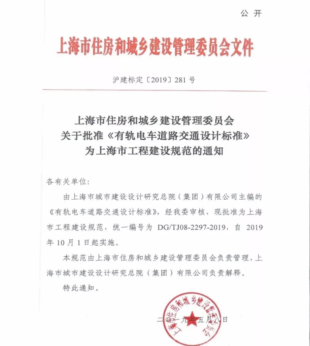 近日,上海市工程建設規范《有軌電車道路交通設計標準》DG/TJ08-2297-2019(以下簡稱“標準”)發布。標準由上海市城市建設設計研究總院主編,于2019年10月1日正式實施。