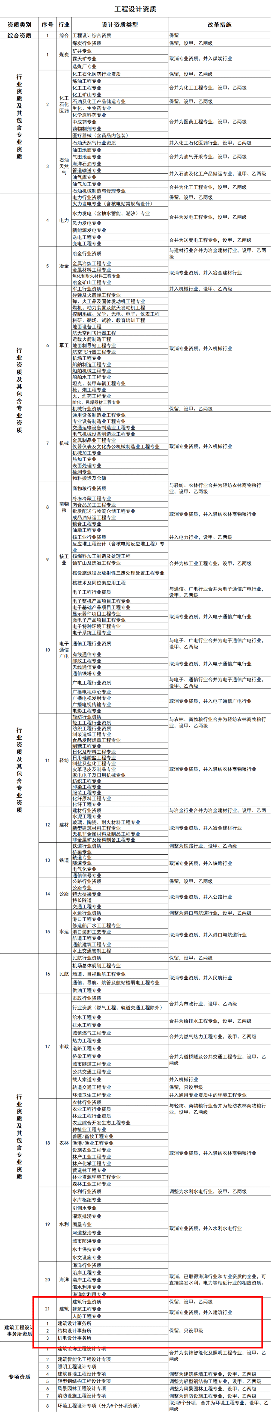 取消其他行業的專業資質,并入相應行業資質,原甲、乙級專業資質并入相應等級的行業資質,原丙級專業資質并入乙級行業資質。