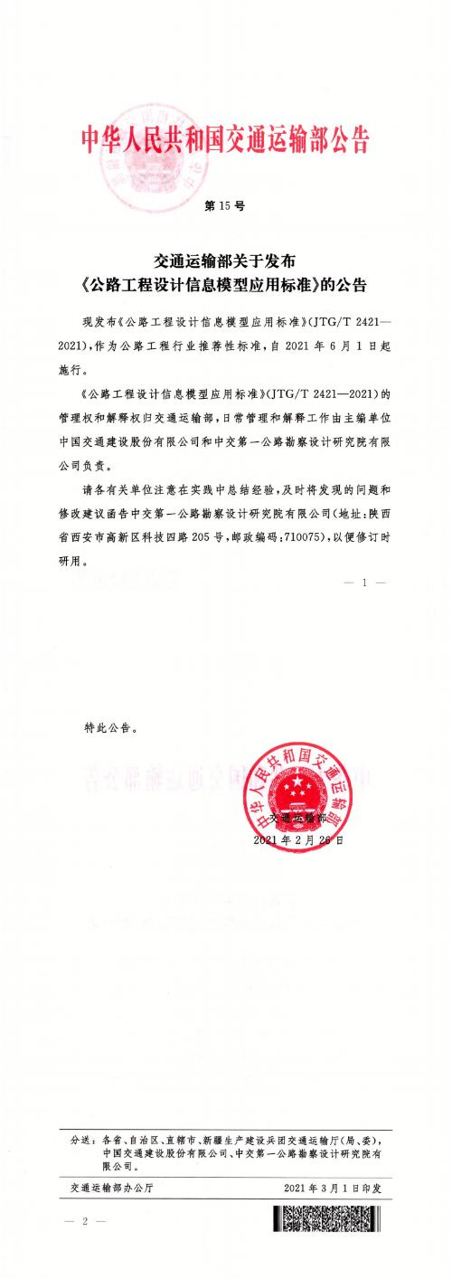 運(yùn)輸部關(guān)于發(fā)布《公路工程設(shè)計(jì)信息模型應(yīng)用標(biāo)準(zhǔn)的公告》