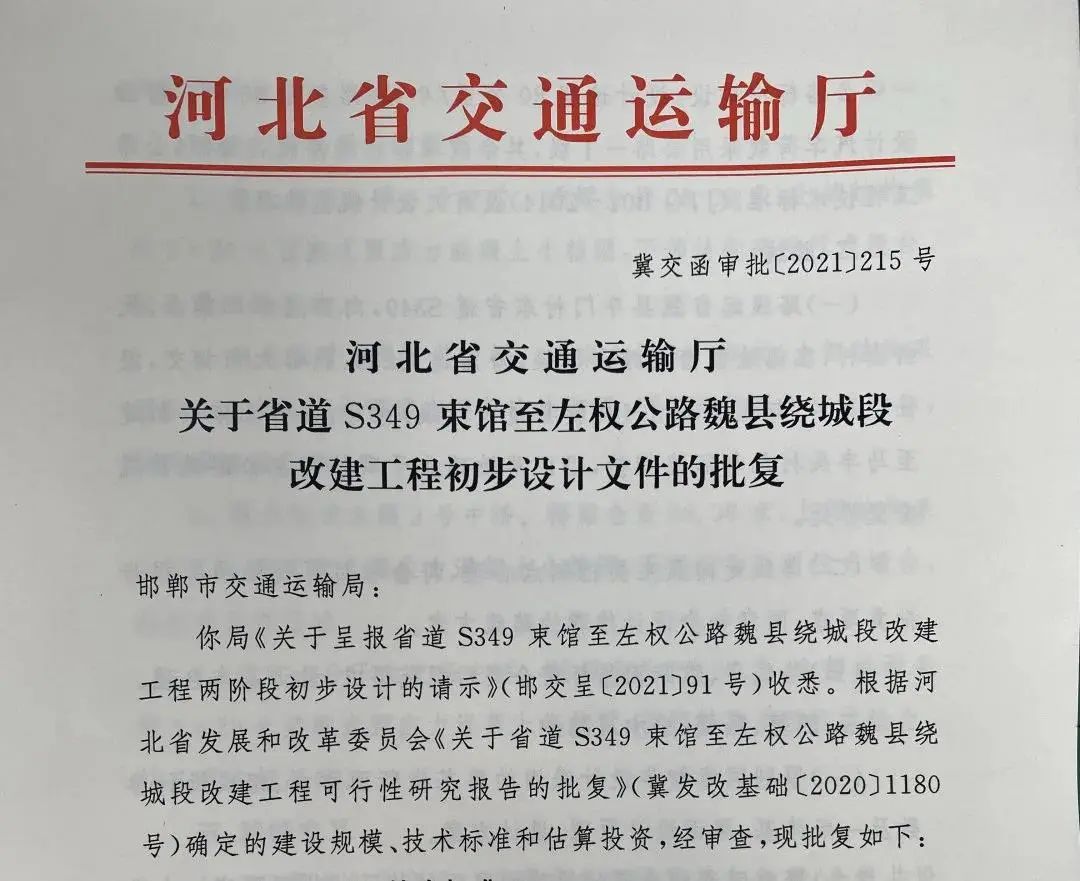 邯鄲S349束左公路魏縣段(新南環)初步設計獲省批