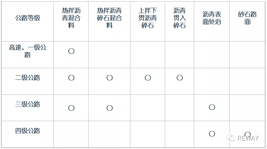 (1)瀝青路面——包括熱拌瀝青混凝土混合料、熱拌瀝青碎石混合料、冷拌瀝青碎石混合料、瀝青貫入式(含上拌下貫瀝青碎石)、瀝青表處等五種。
