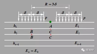 層底拉應(yīng)力以單圓中心 (B點(diǎn))及雙圓輪隙中心 (C點(diǎn))為計(jì)算點(diǎn),并取較大值作為層底拉應(yīng)力。按式(8.0.13)計(jì)算層底最大拉應(yīng)力: