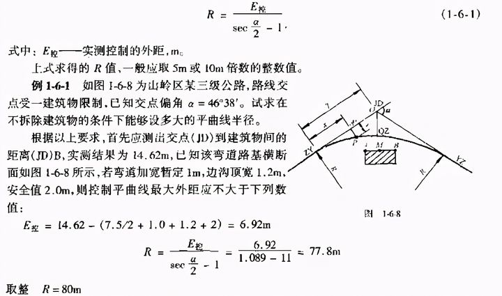 (1)在交點附近有地物,平曲線線位受地形、地物制約時,其半徑的選定通常可以用單交點法或雙交點法解決,平曲線預期通過的理想線位,一般是結合現場實際予以首先確定.然后按平曲線要素幾何關系來推算適應上述線位要求的相應半徑值。對于轉角不大.線位受限制不嚴的平曲線彎道,通常多采用單交點法,控制點位取曲線中點(QZ),根據預期中點線位至交點的實測距離E控按下式計算。