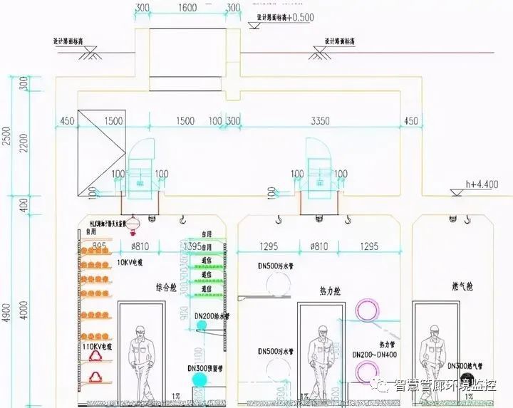 管廊的通風機房一般利用管廊上方的空間設置,同時考慮到相交管線的穿越,管廊頂部覆土深度一 般為2.5-3.0m。這樣的做法導致起點的雨污水支管標高與管廊就不能匹配。但是,管廊的覆土深度并不是只有2.5-3.0m,在特殊情況下,滿足抗浮 的 前提下,將管廊覆土減少至1.5m,此時,進排風井可采用外掛式,滿足通風需求,同時結合雨污水標高,甚至將起點雨污水管道納入綜合管廊。