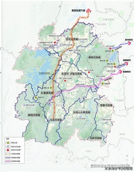 尾水收集:已建馬場至湖潮至南明河的貴安尾水通道,規(guī)劃沿紅楓湖、百花湖新建環(huán)湖綜合管廊,收集沿線朱家河、馬場、高峰、金華等10座污水處理廠尾水,排放至百花湖下游,減輕污水尾水對紅楓湖及百花湖的污染,排放標(biāo)準(zhǔn)為準(zhǔn)Ⅳ類水,計劃遠(yuǎn)期建設(shè)完成。新增金竹環(huán)阿哈湖南部截污管廊、大凹尾水通道,尾水采取跨流域排放模式,分別排放至市西河及南明河,減輕污水尾水對阿哈湖的污染,排放標(biāo)準(zhǔn)為準(zhǔn)Ⅳ類水,計劃近期建設(shè)完成。