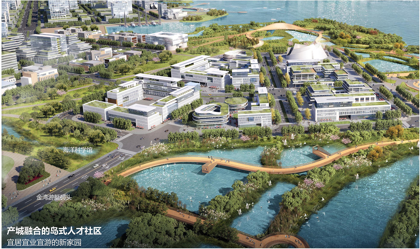 打造湛江藍色產業戰略基地,建設產城融合的島式人才社區。構建生態廊道貫穿島嶼,由島嶼中心向濱海放射滲透,城市與生態共生共融,共同勾勒未來生態的島式生活。總體控制低強度、低密度開發,整體以中低強度,中高密度的產業園區為主,引入人才公寓、信息科技園、雙碳體驗中心等配套設施,提供混合高效的多元空間載體。生態產業片區整體中低強度開發,面向龍王灣局部區域布置高層塔樓,環沙咀頭差異化打造西岸、南岸兩類產業展示面。