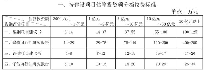 投資決策咨詢包括編制項目建議書、編制可行性研究報告、評估項目建議書、評估可行性研究報告等,取費可參考《國家計委關(guān)于印發(fā)建設(shè)項目前期工作咨詢收費暫行規(guī)定的通知》(計價格〔1999〕1283號),該文件提出了投資額在3000萬元以上的建設(shè)項目前期工作咨詢收費標(biāo)準(zhǔn),而投資額3000萬元以下的建設(shè)項目由各省自行制定,如湖北省制定了相應(yīng)的地方標(biāo)準(zhǔn)——《省物價局關(guān)于制定估算投資額3000萬元以下建設(shè)項目前期工作咨詢收費標(biāo)準(zhǔn)的通知》(鄂價房服〔2001〕107號),具體收費標(biāo)準(zhǔn)根據(jù)估算投資額在收費標(biāo)準(zhǔn)相對應(yīng)的區(qū)間內(nèi)用插入法計算。