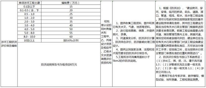 防洪評價咨詢?nèi)≠M可參考地方收費標(biāo)準(zhǔn),如湖南省地方標(biāo)準(zhǔn)——《湖南省物價局、湖南省水利廳關(guān)于公布水利系統(tǒng)服務(wù)性收費項目和標(biāo)準(zhǔn)的通知》(湘價服〔2013〕134號),具體如下: