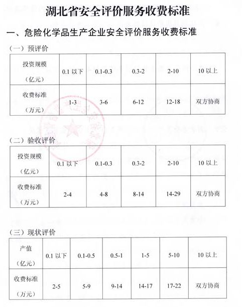 安全評價可參考地方收費標(biāo)準(zhǔn),如湖北省地方收費標(biāo)準(zhǔn)——《省物價局 省安全生產(chǎn)監(jiān)督管理局關(guān)于安全評價服務(wù)收費有關(guān)問題的通知》(鄂價工服〔2016〕56號),具體如下: