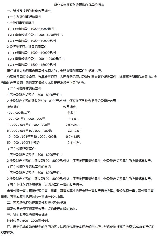 法律咨詢服務(wù)取費可參考地方收費標(biāo)準(zhǔn),如湖北省地方標(biāo)準(zhǔn)——《湖北省物價局、湖北省司法廳關(guān)于印發(fā)<湖北省律師服務(wù)收費管理實施辦法(暫行)>的通知》(鄂價房服〔2006〕258號),具體如下: