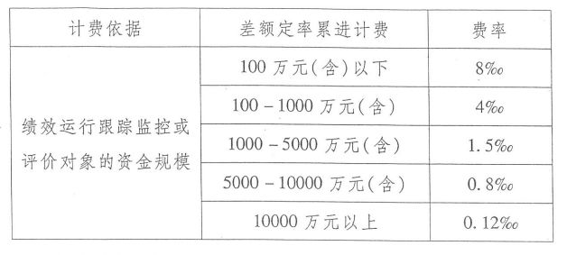全咨單位參與預(yù)算績效管理服務(wù)取費可參考地方收費標(biāo)準(zhǔn),如湖北省地方標(biāo)準(zhǔn)——《湖北省財政廳關(guān)于印發(fā)<湖北省第三方機(jī)構(gòu)參與預(yù)算績效管理工作暫行辦法>的通知》(鄂財績規(guī)〔2014〕3號),績效運行跟蹤監(jiān)控和績效評價全部委托服務(wù)采用計件收費方式的,以績效運行跟蹤監(jiān)控或評價對象的資金規(guī)模為計費依據(jù)。