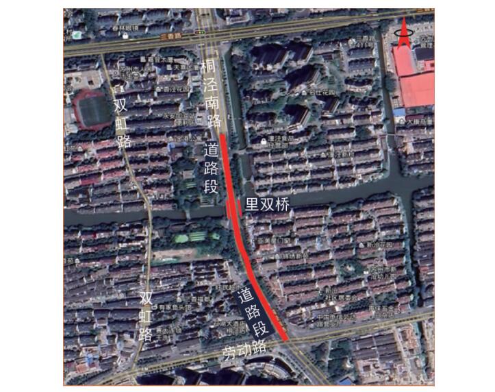 里雙橋重建工程項(xiàng)目范圍為從桐涇南路 - 三香路交叉口下穿段南到桐涇南路 - 勞動(dòng)路交叉口北側(cè),總長(zhǎng)度 502 m。