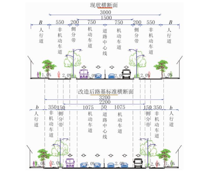 道路現(xiàn)狀為雙向 4 車道,橫斷面布置為 B 人行道 +5.5 m 非機(jī)動(dòng)車道 +2 m 側(cè)分帶 +15 m 機(jī)動(dòng)車道 +2 m 側(cè)分帶 +5.5 m 非機(jī)動(dòng)車道 +B 人行道,B 現(xiàn)狀寬度為不小于 5.5 m。