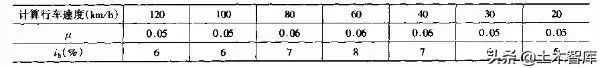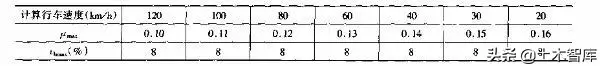 極限最小半徑橫向力系數(shù)及超高橫坡度取用表 表1-2-1