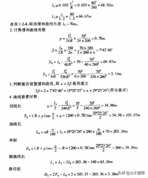 例1-2-4 某平原微丘區(qū)二級(jí)公路有一彎道,其平曲線半徑及R=260m,交點(diǎn)JD校號(hào)