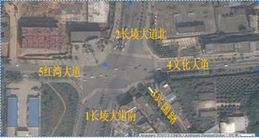 該交叉口位于江西省南昌市新建區(qū)中心城區(qū)西部。由長(zhǎng)堎大道、紅灣大道、文化大道、興國(guó)路五路交叉組成。其中長(zhǎng)堎大道南北方向雙向六車(chē)道主干道,紅灣大道、文化大道是連接新建區(qū)和灣里區(qū)的主要交通干道,興國(guó)路連接新建區(qū)中心城區(qū)并設(shè)有多條公交線(xiàn)路。該交叉處在新建區(qū)大力開(kāi)發(fā)地段,周邊居民區(qū)密集、各道路沿途設(shè)有多家商業(yè)和購(gòu)物中心,并輻射周邊的高校園區(qū)和工業(yè)園區(qū)。由于交叉口交通流量較大、多路相交,加上長(zhǎng)堎大道建成通車(chē)后未能對(duì)交叉口各進(jìn)出口道和內(nèi)部空間進(jìn)行科學(xué)合理的交通渠化設(shè)計(jì),導(dǎo)致交通混行,交通擁堵現(xiàn)象經(jīng)常發(fā)生。交叉口現(xiàn)狀如圖-1所示。