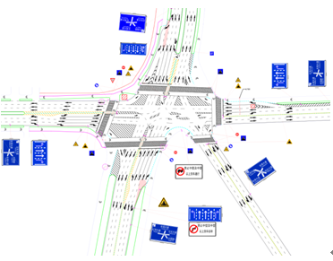 為了減少右轉(zhuǎn)車(chē)輛與非機(jī)動(dòng)車(chē)和行人的相互沖突,保證非機(jī)動(dòng)車(chē)和行人安全順利過(guò)街。優(yōu)化設(shè)計(jì)方案中各路口均增設(shè)行人讓行標(biāo)志標(biāo)牌以及各類(lèi)護(hù)欄。同時(shí),為了保證車(chē)輛進(jìn)入交叉口前獲得道路信息和行車(chē)信息各路口增設(shè)了行車(chē)道指示牌和道路指示牌。