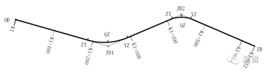 在路線平面圖中,轉(zhuǎn)折處應(yīng)注寫交點(diǎn)代號(hào)并依次編號(hào),如JD2 表示第2個(gè)交點(diǎn)。還要注出曲線段的起點(diǎn)ZY(直圓點(diǎn))、中點(diǎn)Qz(曲中點(diǎn))、終點(diǎn)YZ(圓直點(diǎn))的位置。為了將路線上各段平曲線的幾何要素值表示清楚,一般還應(yīng)在圖中的適當(dāng)位置列出平曲線要素表。如果設(shè)置緩和曲線,則將緩和曲線與前、后段直線的切點(diǎn)分別標(biāo)記為ZH(直緩點(diǎn))和HZ(緩直點(diǎn));將圓曲線與前、后段緩和曲線的切點(diǎn)分別標(biāo)記為HY(緩圓點(diǎn))和YH(圓緩點(diǎn))。
