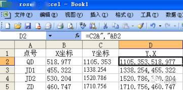 在實(shí)際工作中路線導(dǎo)線的坐標(biāo)數(shù)據(jù)都是用Excel 表格存放。這樣簡(jiǎn)化了在繪圖時(shí)輸入坐標(biāo)的麻煩,在Excel表格中編輯導(dǎo)線點(diǎn)坐標(biāo)對(duì),如圖11-2 所示,選中D2 欄,輸入公式“C2&" ,"&B2”,按回車鍵,系統(tǒng)自動(dòng)生成了所需要的坐標(biāo)對(duì)。選中 D2欄,將光標(biāo)指向第二欄右下角,系統(tǒng)出現(xiàn)黑色小十字標(biāo)記,按住鼠標(biāo)左鍵向下拖動(dòng)十字標(biāo)記,一直到ZD,D2欄就自動(dòng)生成了對(duì)調(diào)后的各交點(diǎn)的坐標(biāo)對(duì),并將他們依次復(fù)制下來(lái)。