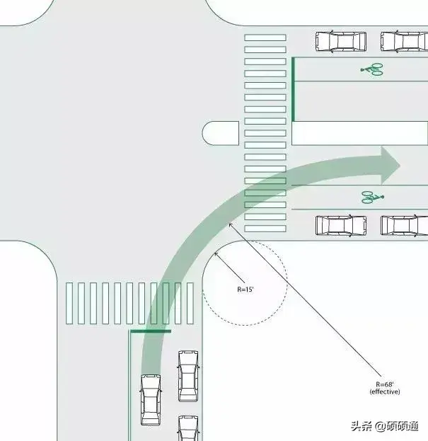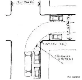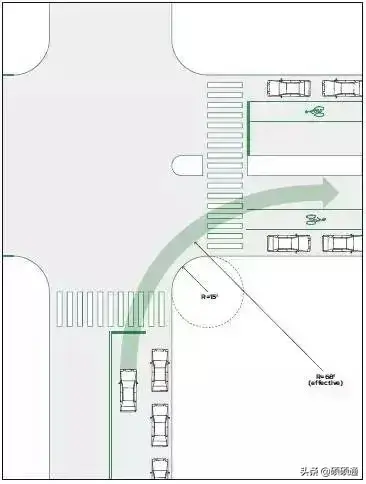 《美國城市街道設計手冊》規定,常規城市道路交叉口轉彎半徑是3~4.5米(10~15英尺),且在很多城市,轉彎半徑用了非常小的0.6米(2英尺),大于4.5米的轉彎半徑只會在極特殊情況下才會采用。