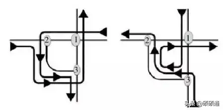 扇形交叉口左轉車輛的交通組織如圖所示: