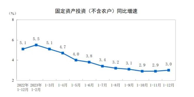 2023年,全國固定資產投資(不含農戶)503036億元,比上年增長3.0%(按可比口徑計算),增速比1—11月份加快0.1個百分點。其中,制造業投資增長6.5%,增速加快0.2個百分點;基礎設施投資(不含電力、熱力、燃氣及水生產和供應業)增長5.9%,增速加快0.1個百分點。從環比看,12月份固定資產投資(不含農戶)增長0.09%。2023年,民間固定資產投資253544億元,比上年下降0.4%,降幅比1—11月份收窄0.1個百分點。