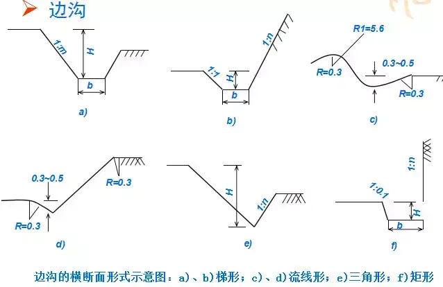1.邊溝:邊溝用于匯集和排除降落在路基范圍內(nèi)以及流向路基的少量地表水。邊溝設(shè)置在挖方路基的路肩外側(cè)或低路堤的坡腳外側(cè),多與路中線(xiàn)平行,用以匯集和排除路基范圍內(nèi)流向路基的少量地面水。