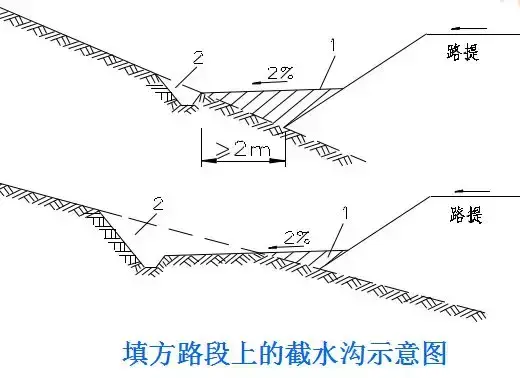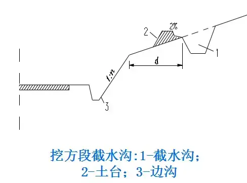 2.截水溝:又稱(chēng)天溝,一般設(shè)置在挖方路基邊坡坡頂以外,或山坡路堤上方的適當(dāng)?shù)攸c(diǎn),用以攔截并排除路基上方流向路基的地面徑流。
