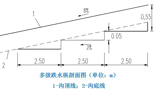 跌水構(gòu)造:?jiǎn)渭?jí)和多級(jí)之分,溝底有等寬與變寬之別。基本構(gòu)造可分為進(jìn)水口、消力池和出水口三個(gè)部分。
