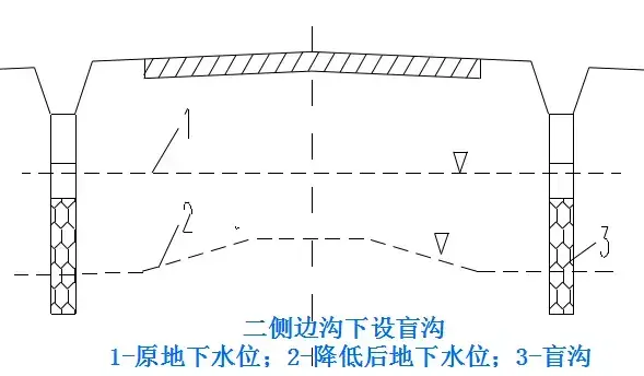 (1)路線(xiàn)高度與原地面相仿,排水困難,距地面有滲透性土層。