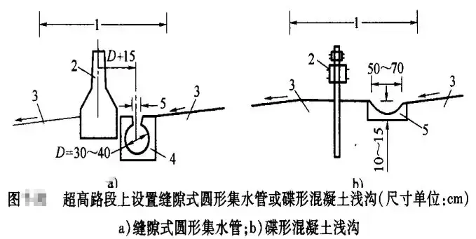 (1)寬度小于3m且表面采用鋪面封閉的中央分隔帶排水,降落在分隔帶上的表面水排向兩側(cè)行車(chē)道,其坡度與路面的橫坡度相同;在超高路段上,可在分隔帶上側(cè)邊緣處設(shè)置緣石或泄水口,或者在分隔帶內(nèi)設(shè)置縫隙式圓形集水管或碟形混凝土淺溝和泄水口,以攔截和排泄上側(cè)半幅路面的表面水。緣石過(guò)水?dāng)嗝娴男顾诳刹捎瞄_(kāi)口式,格柵式或組合式;碟形混凝土淺溝的泄水口采用格柵式。
