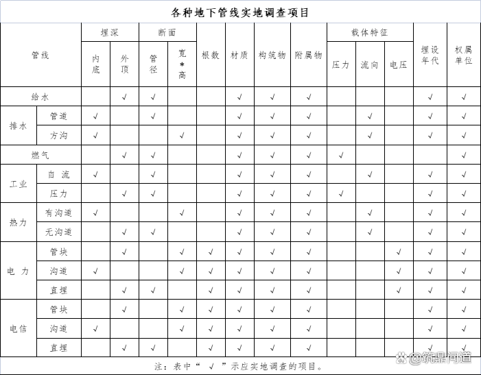 地下管線調查項目有地下管線的平面位置、埋深(或高程)、流向、壓力以及管線規格、性質、材料、權屬等屬性。